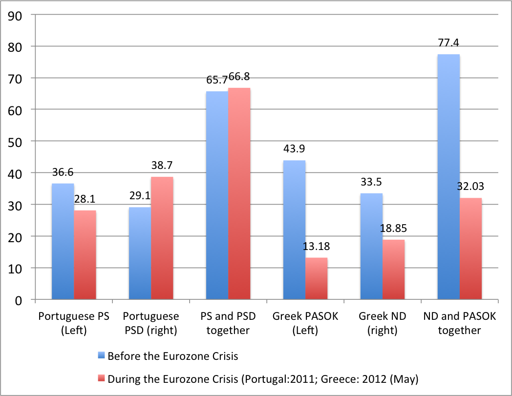 I see two explanations for this. First, as I argued here, Portuguese citizens seem to prefer “exit” (abstention, emigration) over “voice”. Second, the base of support for Greek parties drew heavily on a spoils system (public sector jobs, pensions, cartelistic rights) and they didn’t differ much ideologically. By reducing public spending and removing these cartelistic rights, austerity directly undermines their base of support. Since PASOK and ND could no longer offer rents to voters because the money was gone, voters abandoned them. In Portugal, austerity had started before the crisis, as the 2000s were a lost decade in terms of growth (no real estate bubble). Hence, parties could not rely on the kind of spoils system that PASOK and ND drew on. There is some data on party patronage that shows these differences.
