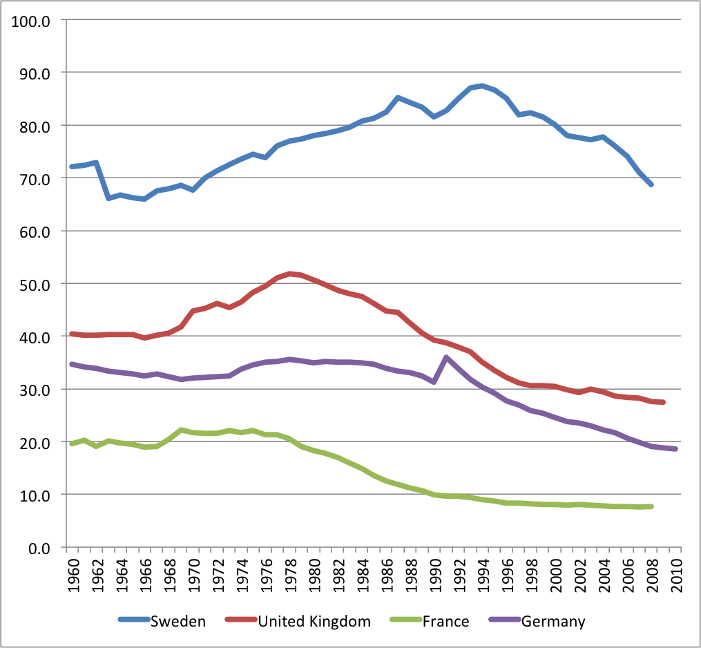 British union are weak compared to similar countries. Union density is higher than in France and Germany but way below Sweden.However, the real weakness of British unions is the lack of any significant institutional involvement in decision-making processes. This influence has been totally curtailed since Margaret Thatcher and hasn’t been restored under New labour: the lack of a bar does not represent missing data but a zero as decade average. When it comes to what we call concertation, (or the institutionalised participation of unions in policymaking), union influence in the UK is much weaker than anywhere else in Europe.