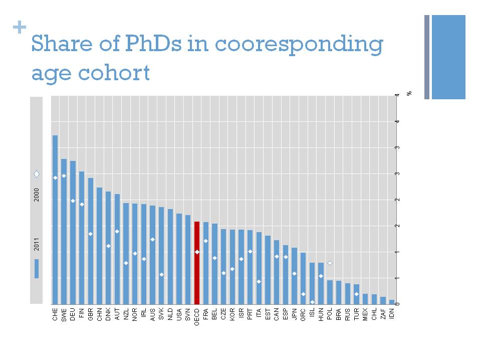 How can we explain this trend? One of the underlying structural factors has been the massive expansion in the number of PhDs all across the OECD. Figure 1 shows the proportion of PhD holders as a proportion of the corresponding age cohort in a number of OECD countries at two points in time, in 2000 and 2009. As you can see, this share has increased by about 50% in 9 years, and this increase has been particularly pronounced in countries such as Portugal, Greece or Slovakia, where it nearly tripled, however from a low starting level. Even in countries with an already high share, the increase has been substantial: 60% in the UK, or nearly 30% in Germany. Since 2000 the number of OECD-area doctorates has increased at an average of 5% a year. [5a]