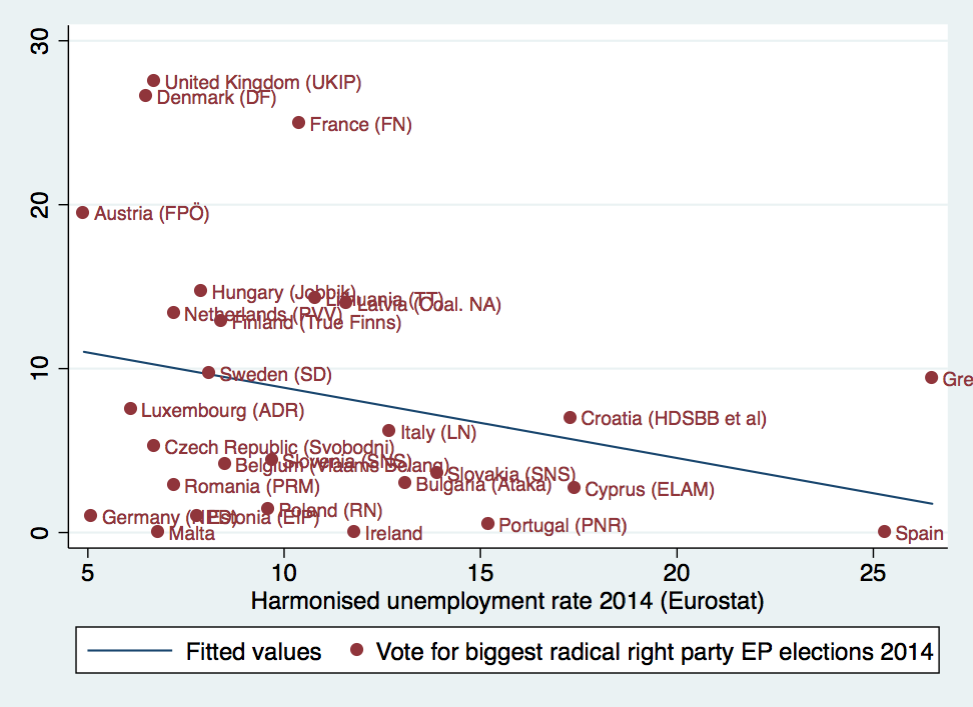 I have made a quick scatterplot plotting together the share of votes for the biggest far right party in each country that took part in the EP elections 2014 yesterday (on the y axis, from Euractiv) and the harmonised unemployment rate (on the x axis, from Eurostat) (Stata datafile here). Any mistake in the coding of far-right parties is mine (I am not overly confident about central and Eastern Europe), and this classification is surely an always contentious issue. There seems to be a small to moderate negative correlation between these two variables (the lower the unemployment, the bigger the far-right vote), but of course there may be a myriad intervening variables, and this is a much too coarse analysis. There are many countries where there is no or only an insignificant far right party, and one doesn’t know how this relationship would look over time, namely with different levels of unemployment across time within the same country. However, the fact that the strongest far right parties stem from countries that are doing relatively well economically (in the upper left corner) is quite significant.