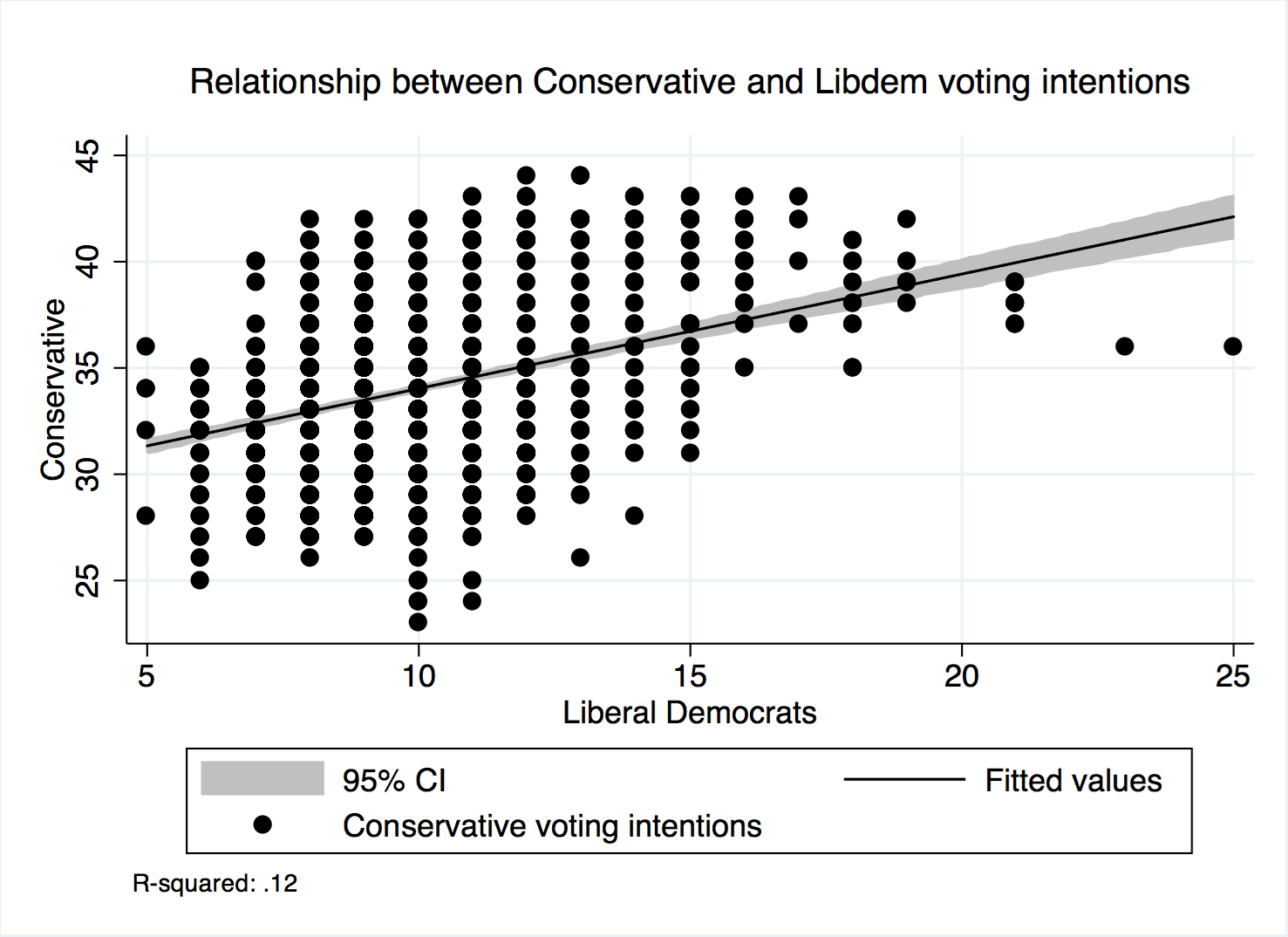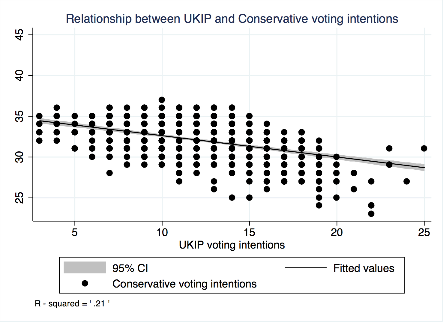 Now look at the relationship between Conservative and UKIP voting intentions. The relationship is much clearer, and the dots are much closer to the line. 20% of the Conservative vote can be explained by the UKIP vote. When the UKIP vote goes up 1%, the Conservatives lose on average 0.26%.