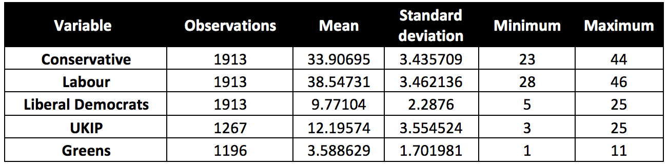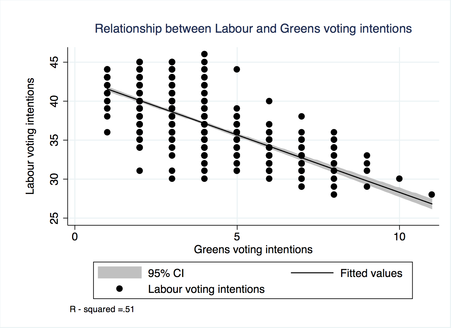 Something similar happens with Labour: its voting intentions are negatively associated with Greens and UKIP voting intentions. The association between the Green and Labour vote is actually even stronger: R-squared is 0.51, which means that 51% of the variation in the Labour vote can be explained by the Green vote. The relationship goes in a similar direction with UKIP. When the UKIP vote goes up 1%, the Labour vote goes down 0.76% on average, and 58% of the Labour vote can be explained by the UKIP vote.