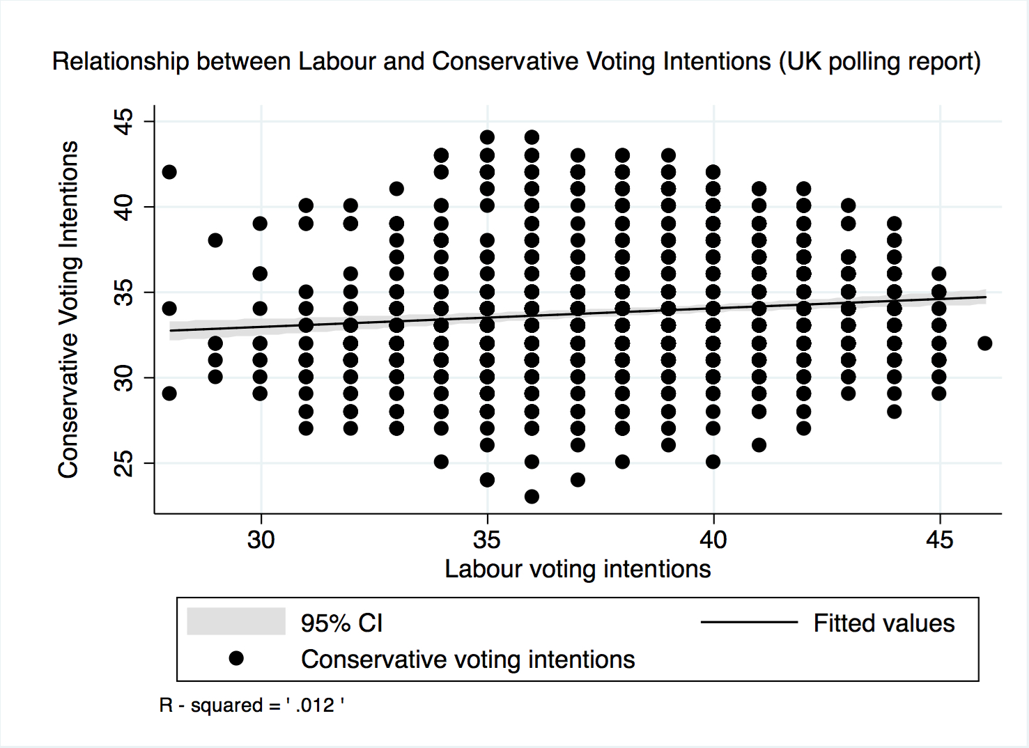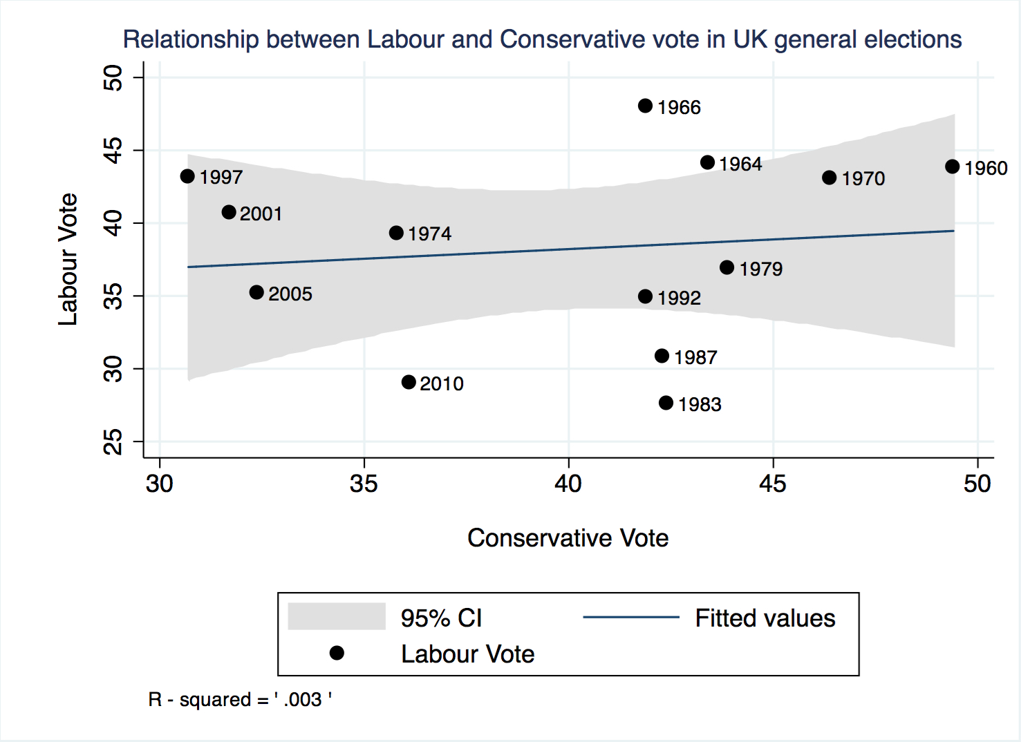 Now look at the same graph for elections in the United Kingdom. There is no correlation whatsoever between the level of the Conservative Vote and the level of the Labour vote. The R-squared is close to zero, and the results are not statistically significant. This means that the level of the Labour vote cannot be explained by the level of the Conservative vote: when the Labour vote goes down, the Conservative vote doesn’t go up. They are completely unconnected to each other, which seems to imply that that there are very small voter movements from Labour to the Conservatives (this is confirmed by British election survey data). When the Tories lose votes, they go elsewhere.