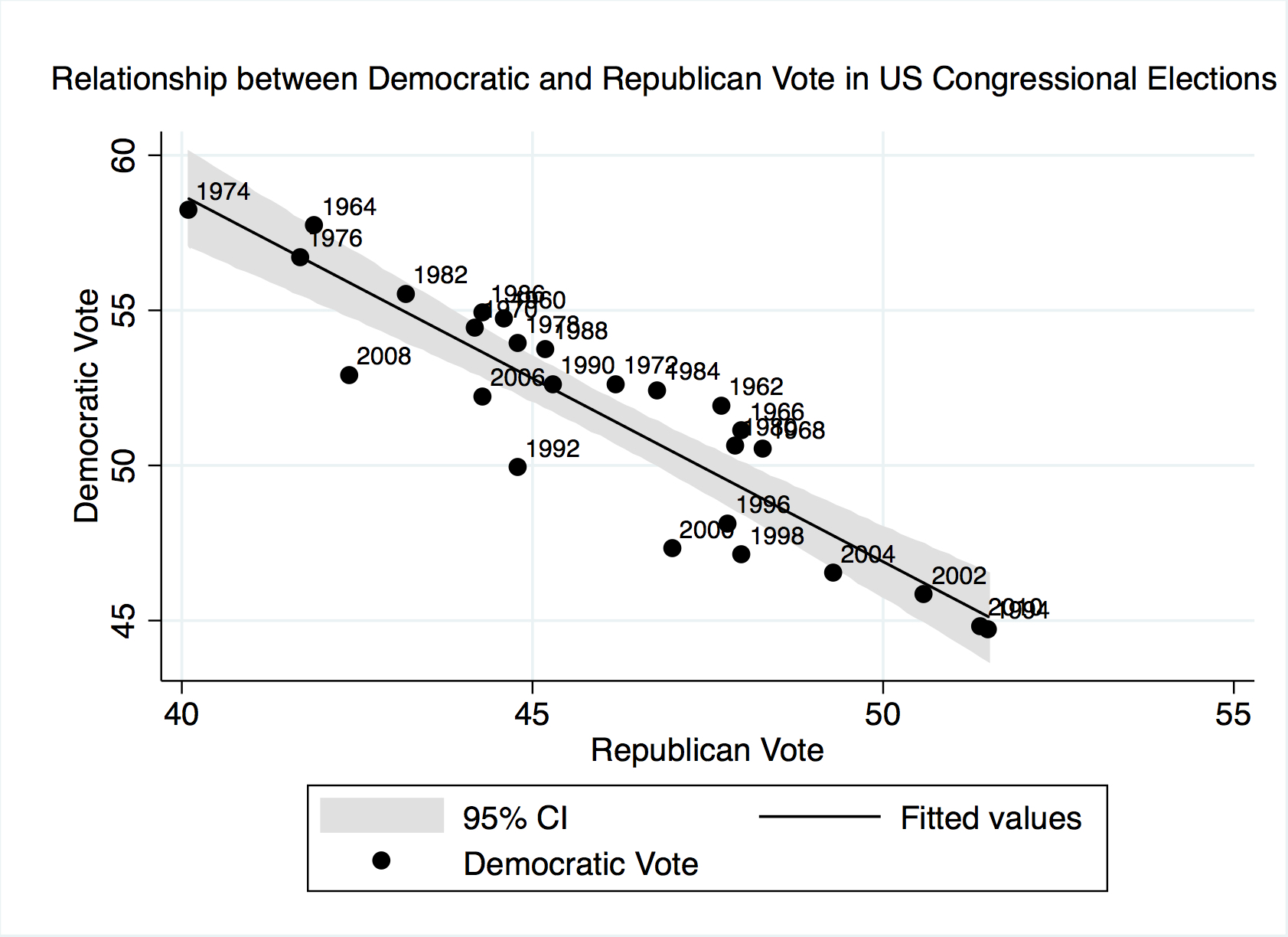 In the theory, the median voter swings from one side to the other, depending on the promises made by the different parties (there is a movie with Kevin Costner about this). In a perfect bipartisan system, one vote lost for one party is a vote won for the other party. This means that the vote share of one party is more or less perfectly correlated with the votes for the other party: 1% more for one party means 1% less for the other party. This describes very well the relationship between the Democratic and the Republican vote in the US, where there are only two relevant parties. The graph below plots together the vote share of the two main parties in Congressional elections between 1960 and 2008. All points (years) are very close to the line. The R-square statistic means that 82% of the variation in the Democratic vote can be explained by the Republican vote. If the Republican vote increases by 1% of the total vote, the Democratic vote is lower by 1.18%.