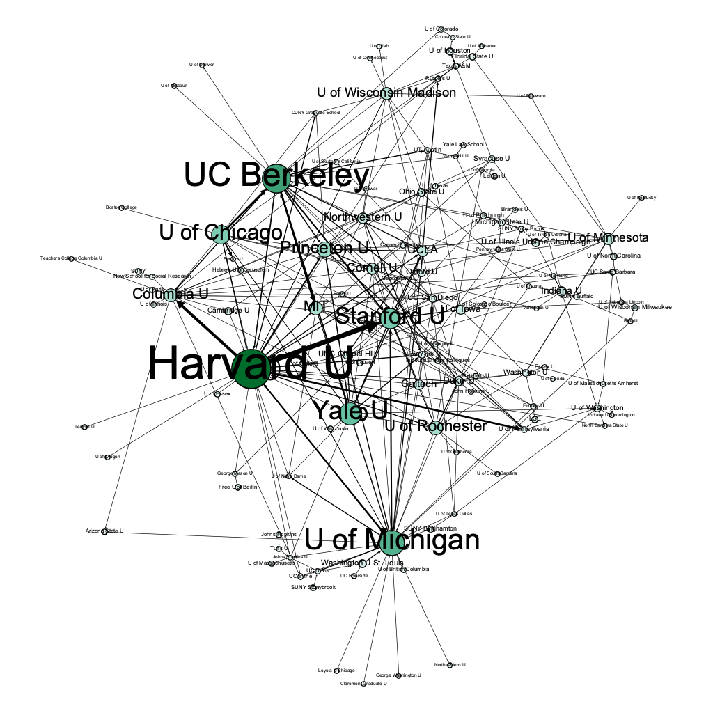 In the graph below, I have used this data to build a network of universities where each arrow represents a flow of political scientists in the top 400 linking the institution where they obtained their PhD (the source) and the institution where they worked in 2017 (the target). The size of the nodes represents the out-degree (the number of individuals who got their PhD from that institution) and the size of the arrows represents the number of academics