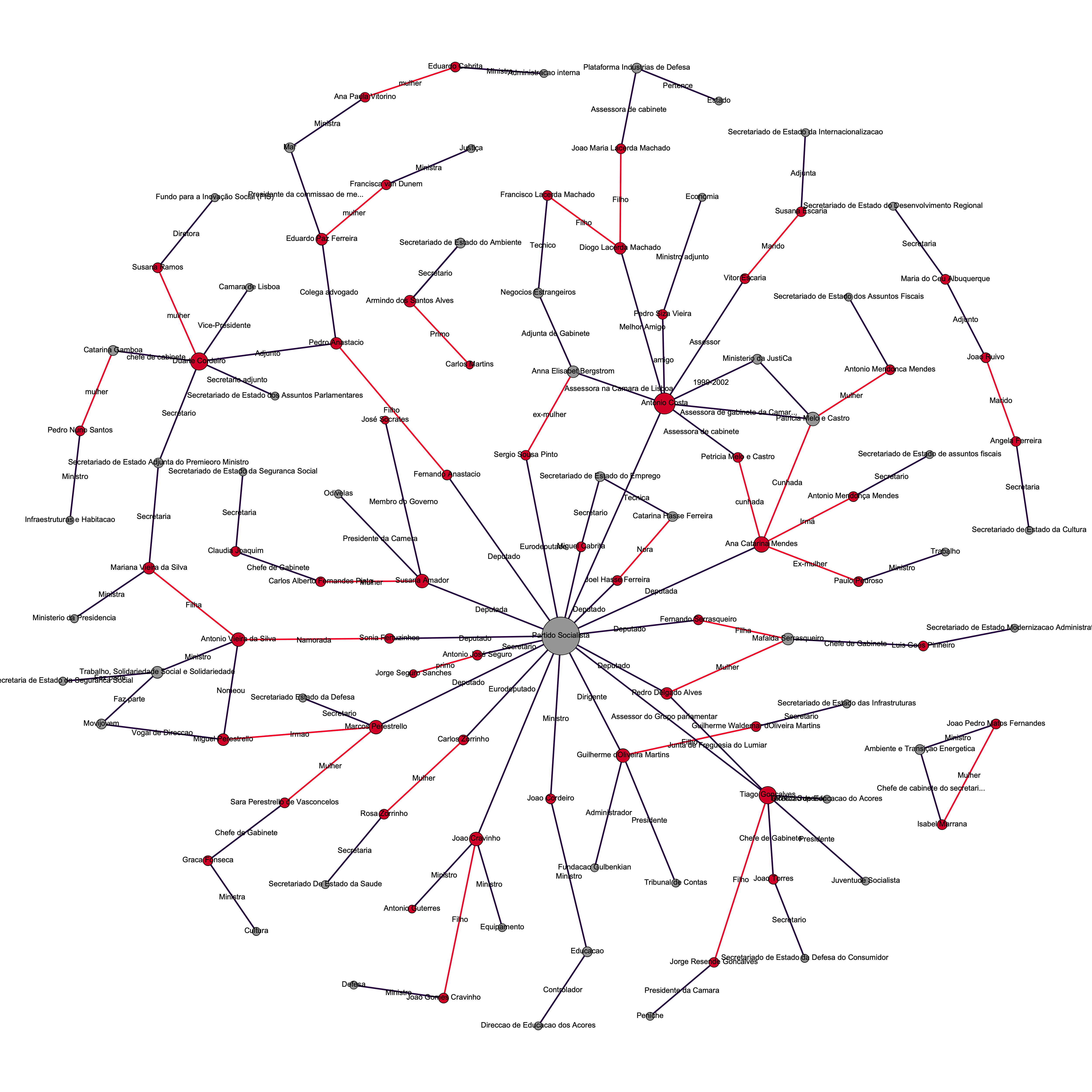 rede de relações familiares no governo de António Costa usando o artigo do Jornal Economico. O que fiz concretamente: fiz uma lista de indivíduos e entidades governativas mencionadas no artigo e o tipo de ligações entre elas. As ligações familiares (e em certos casos amigáveis) estão indicadas em vermelho. Os indivíduos estão em vermelho e as entidades em cinzento. E possível aceder uma versão alta resolução se clicar na imagem.